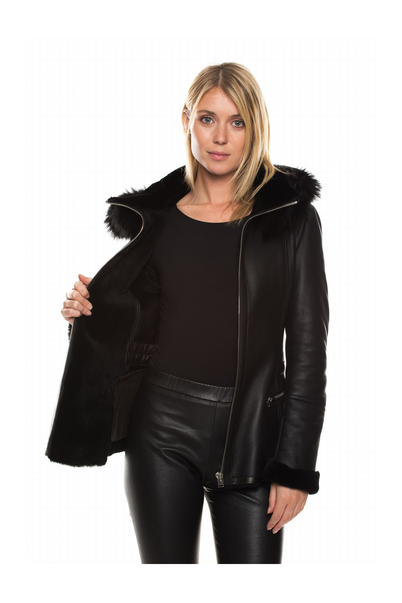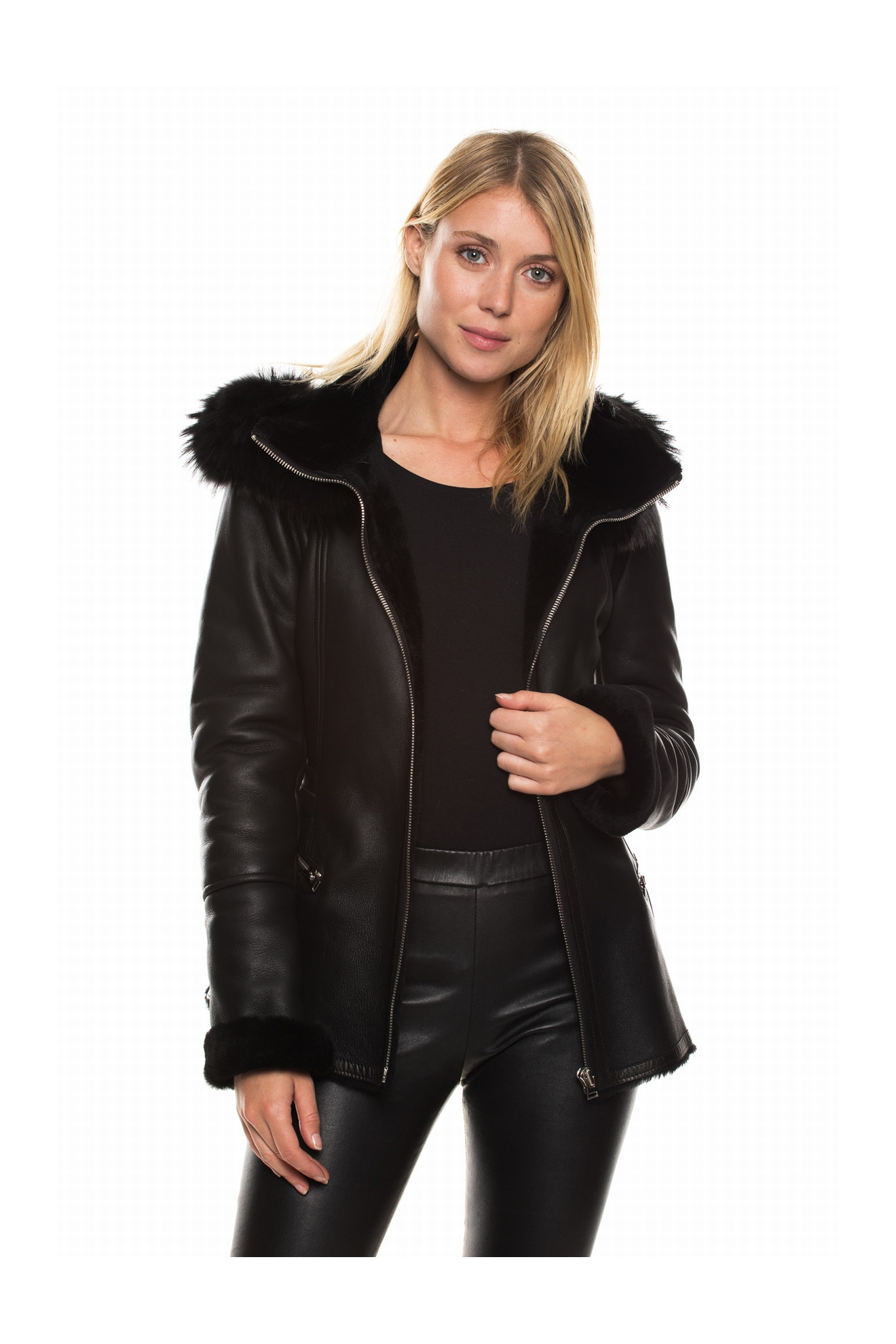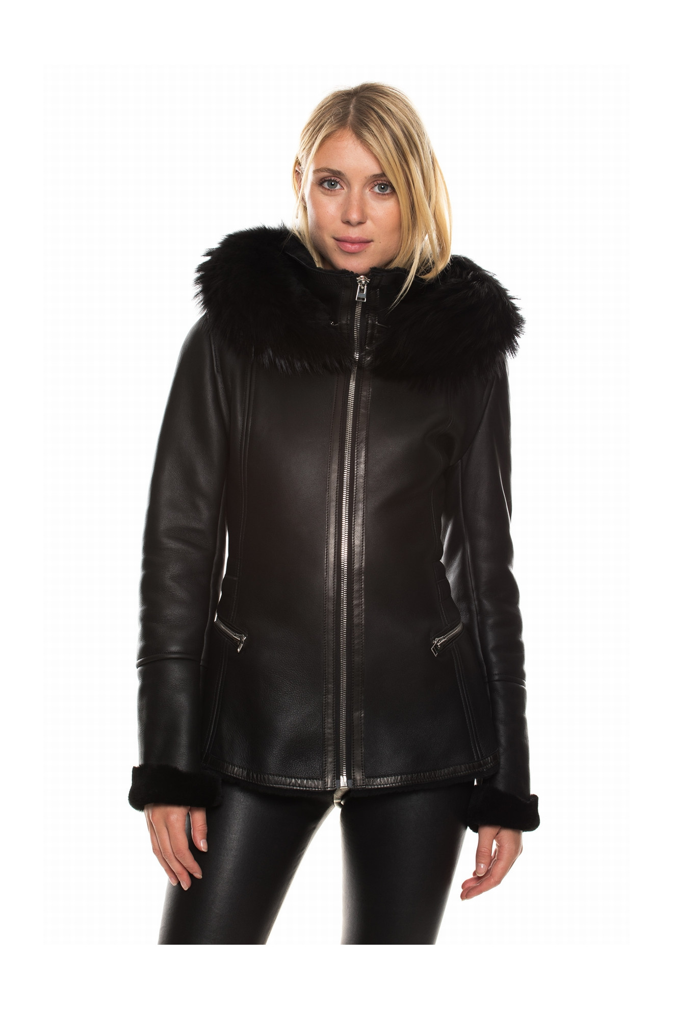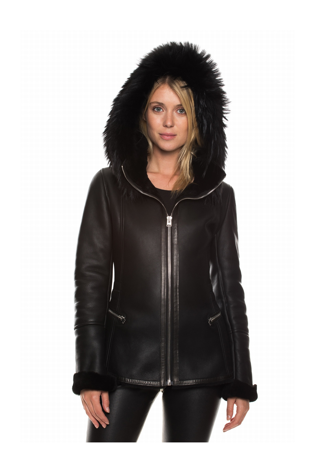 ELENA SOFT is a lamb leather jacket with a hood trimmed with finnraccoon fur.