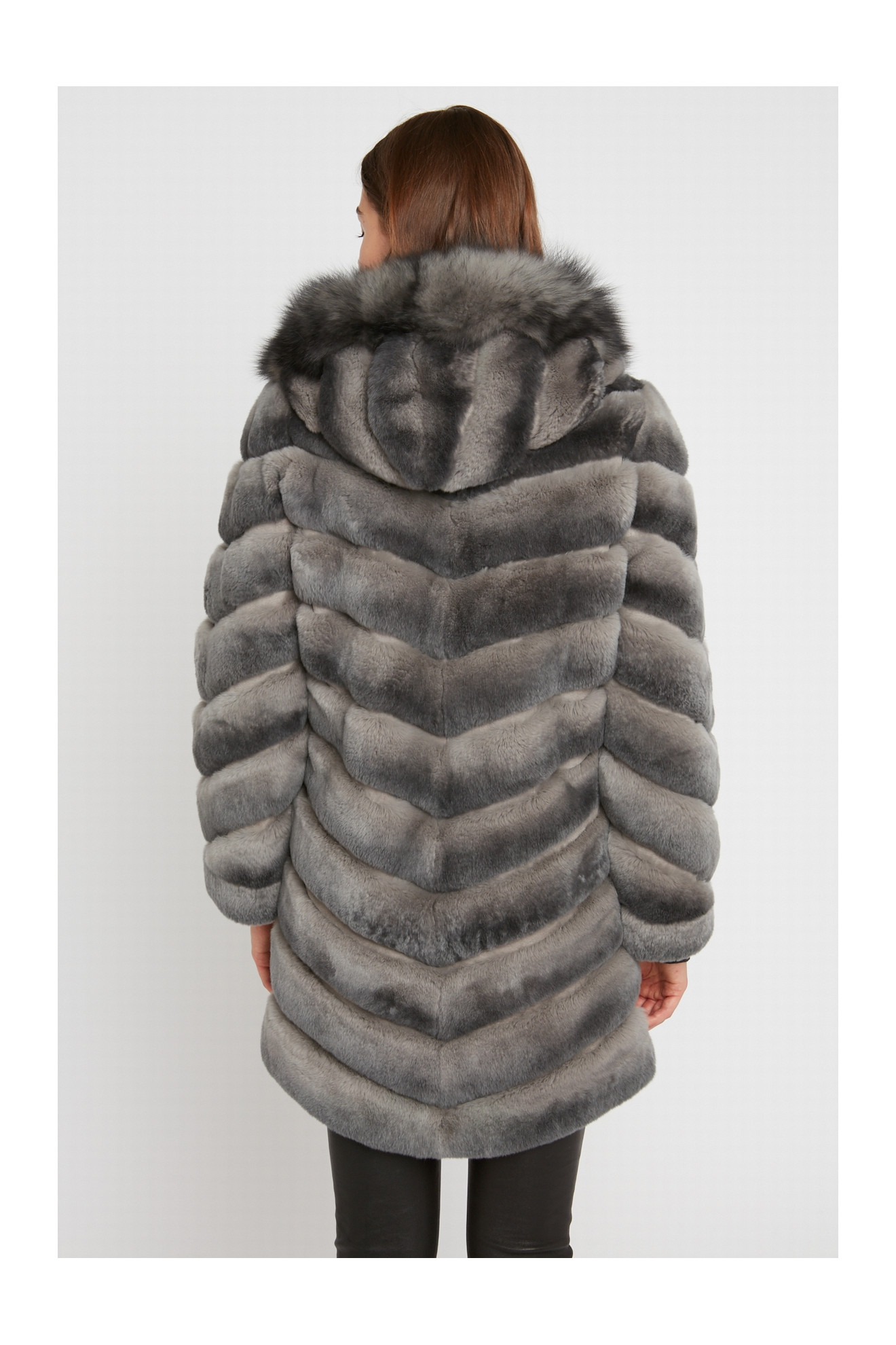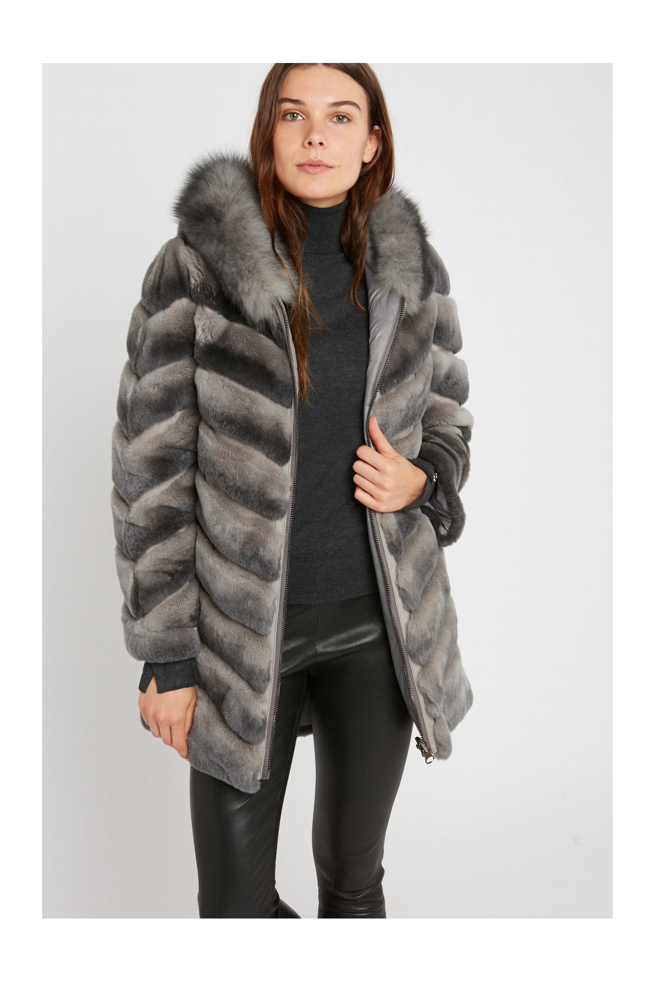 SHANTTI REX LONG is a reversible coat in rex rabbit fur with a hood.