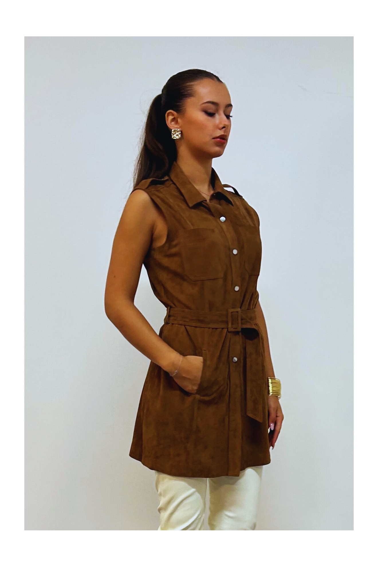 Le modèle SOLVEIG VEL est une tunique chemise courte en daim.