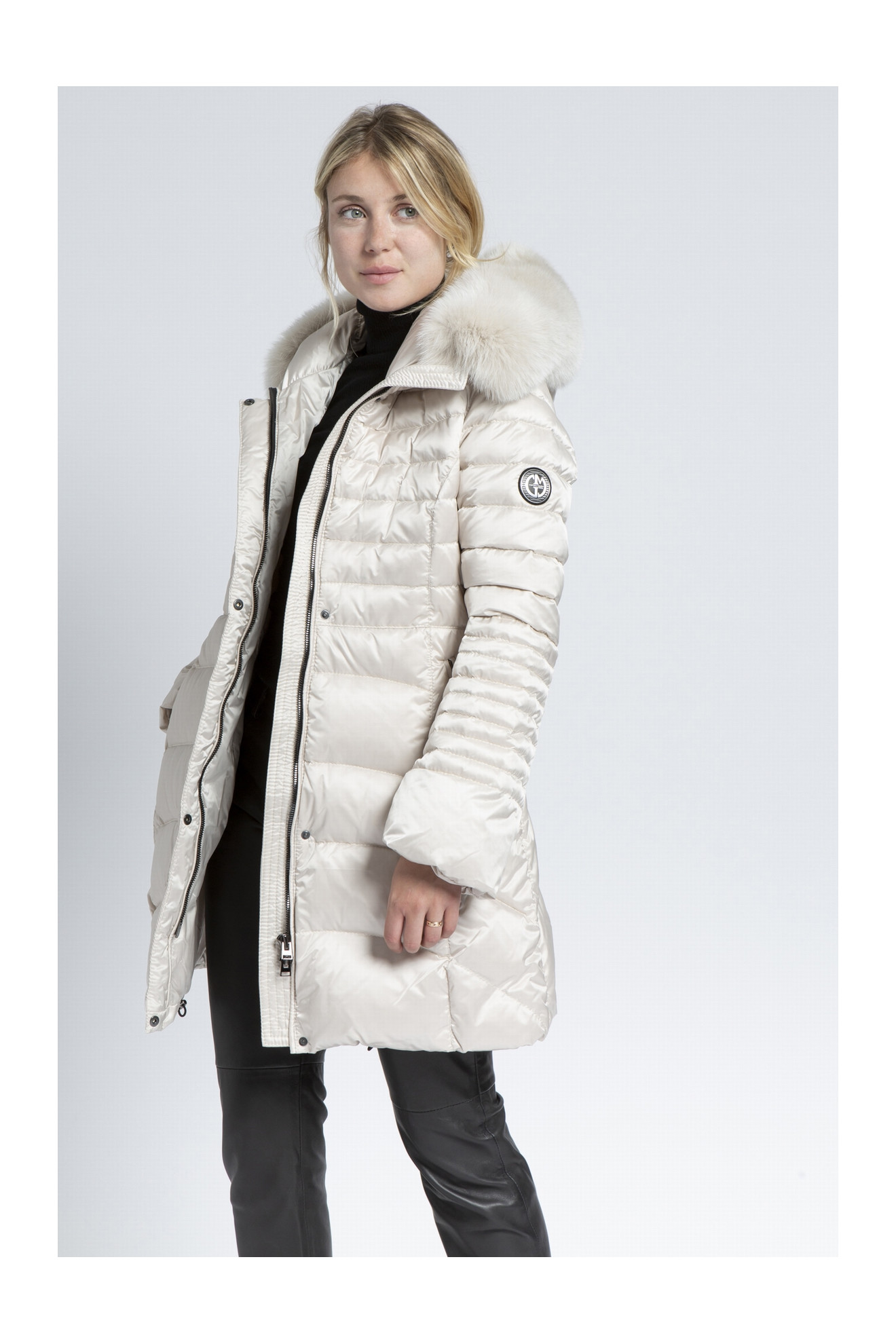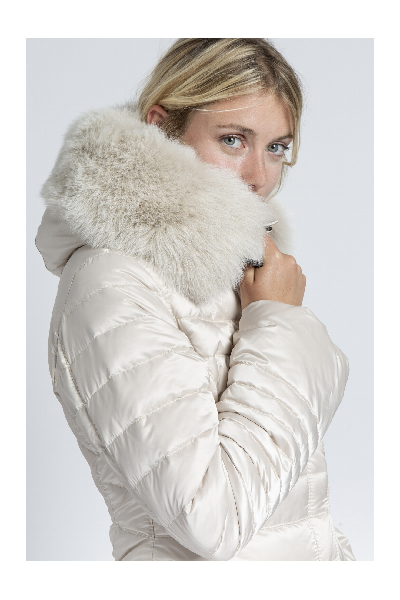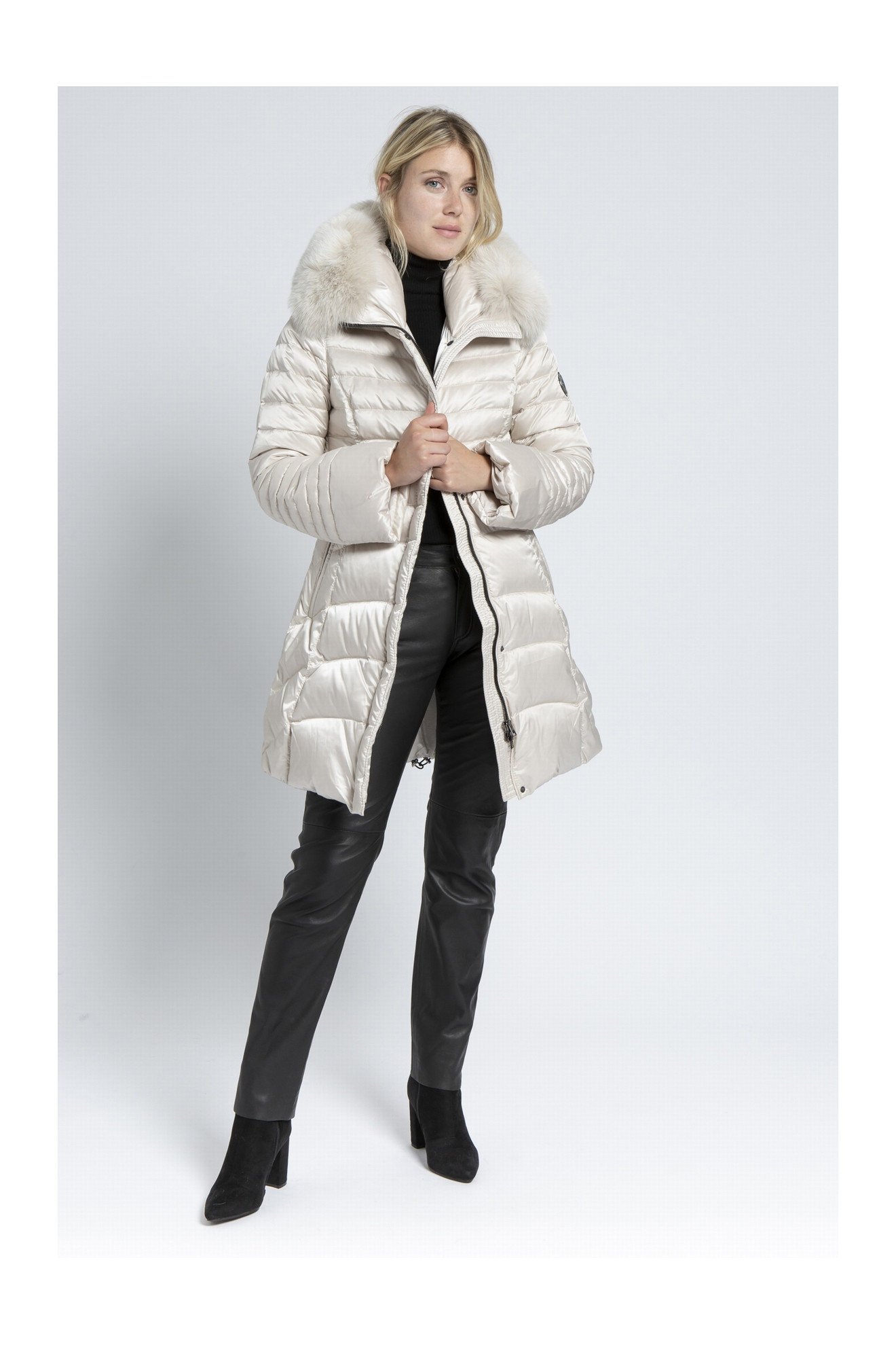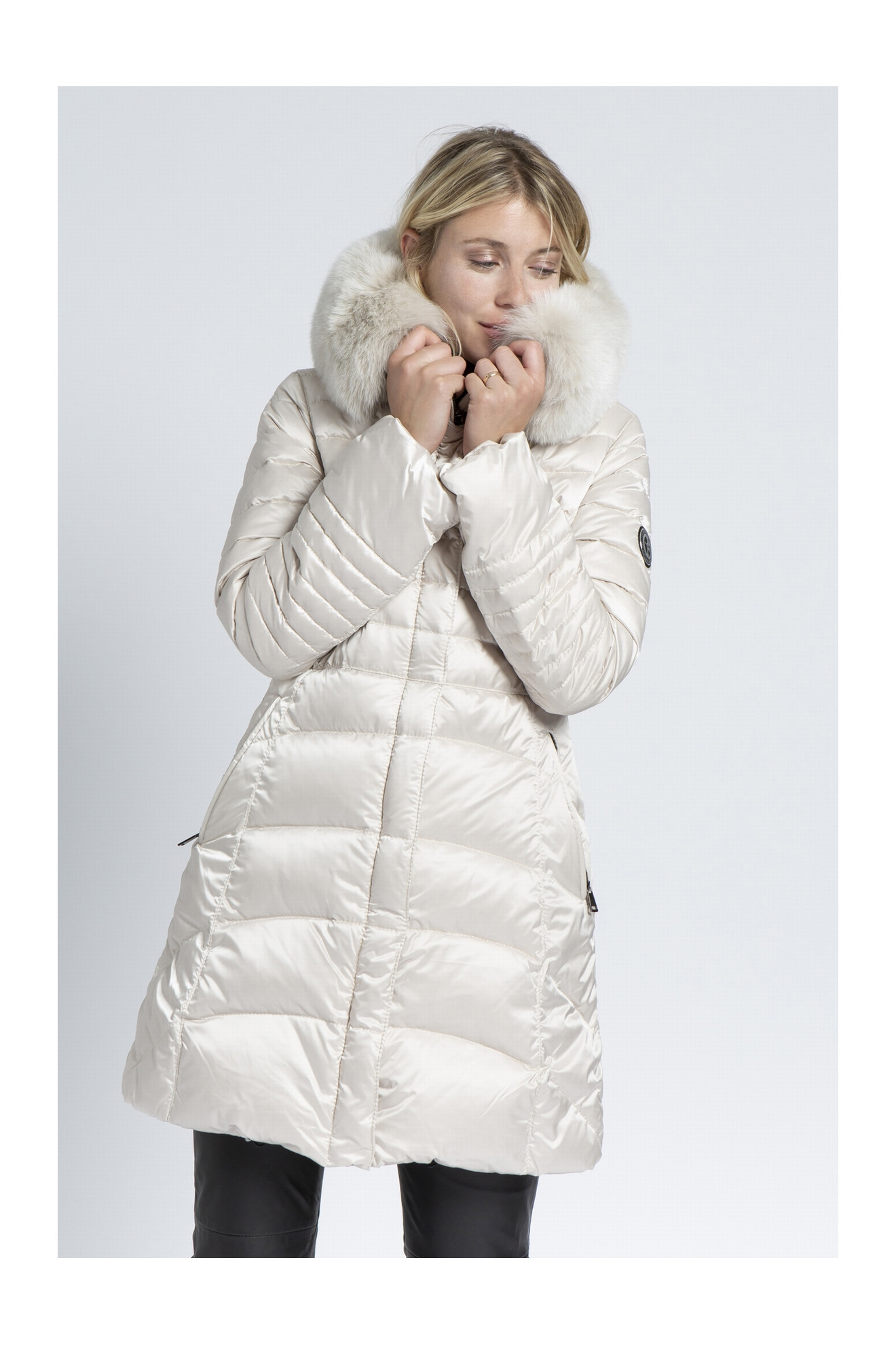 Le modèle DOMICIME est une doudoune en duvet d'oie avec une capuche bordée de renard.