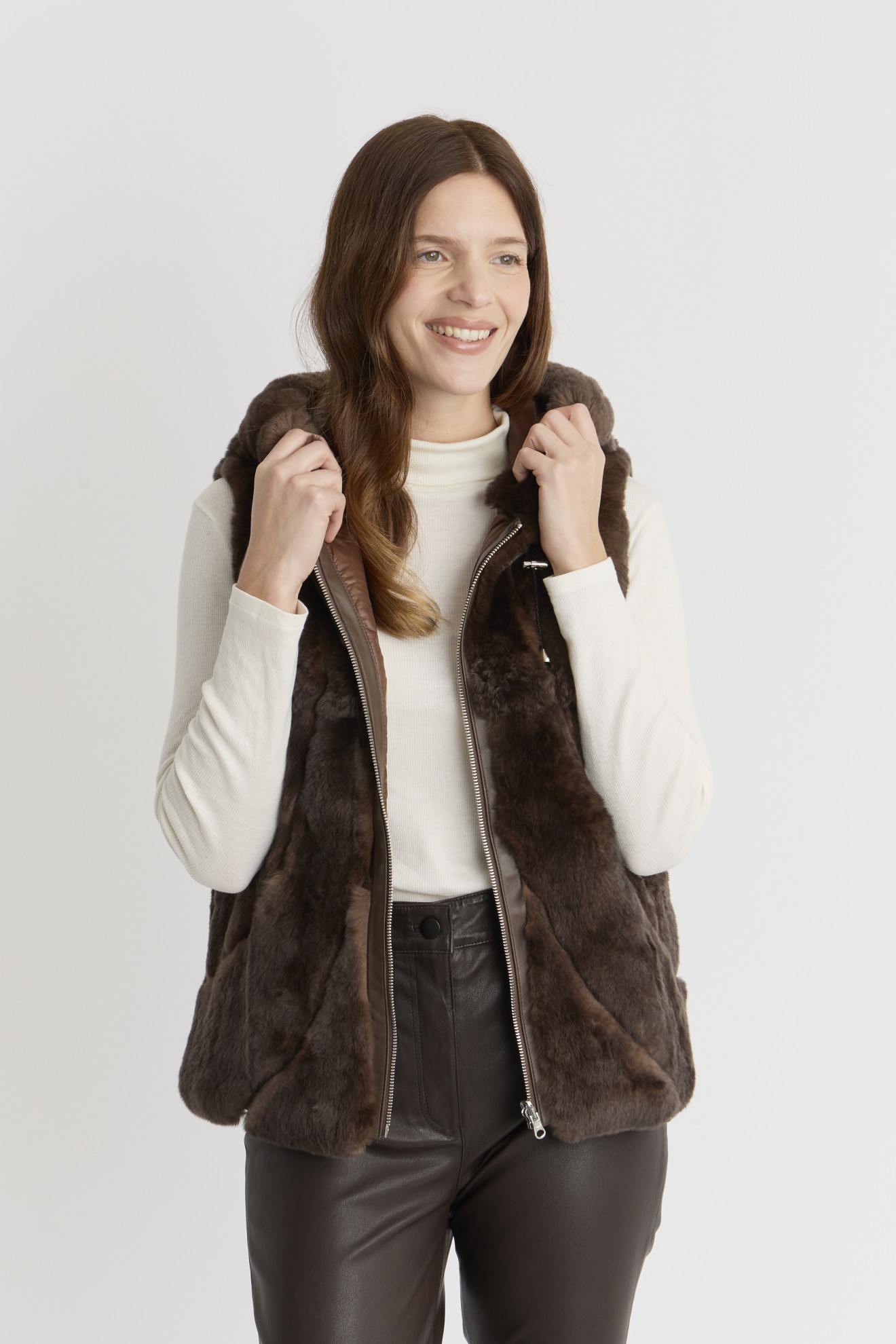 Découvrez le modèle BLEUET de chez Giorgio & Mario, un gilet sans manches en fourrure de lapin Rex à capuche qui allie élégance et confort.