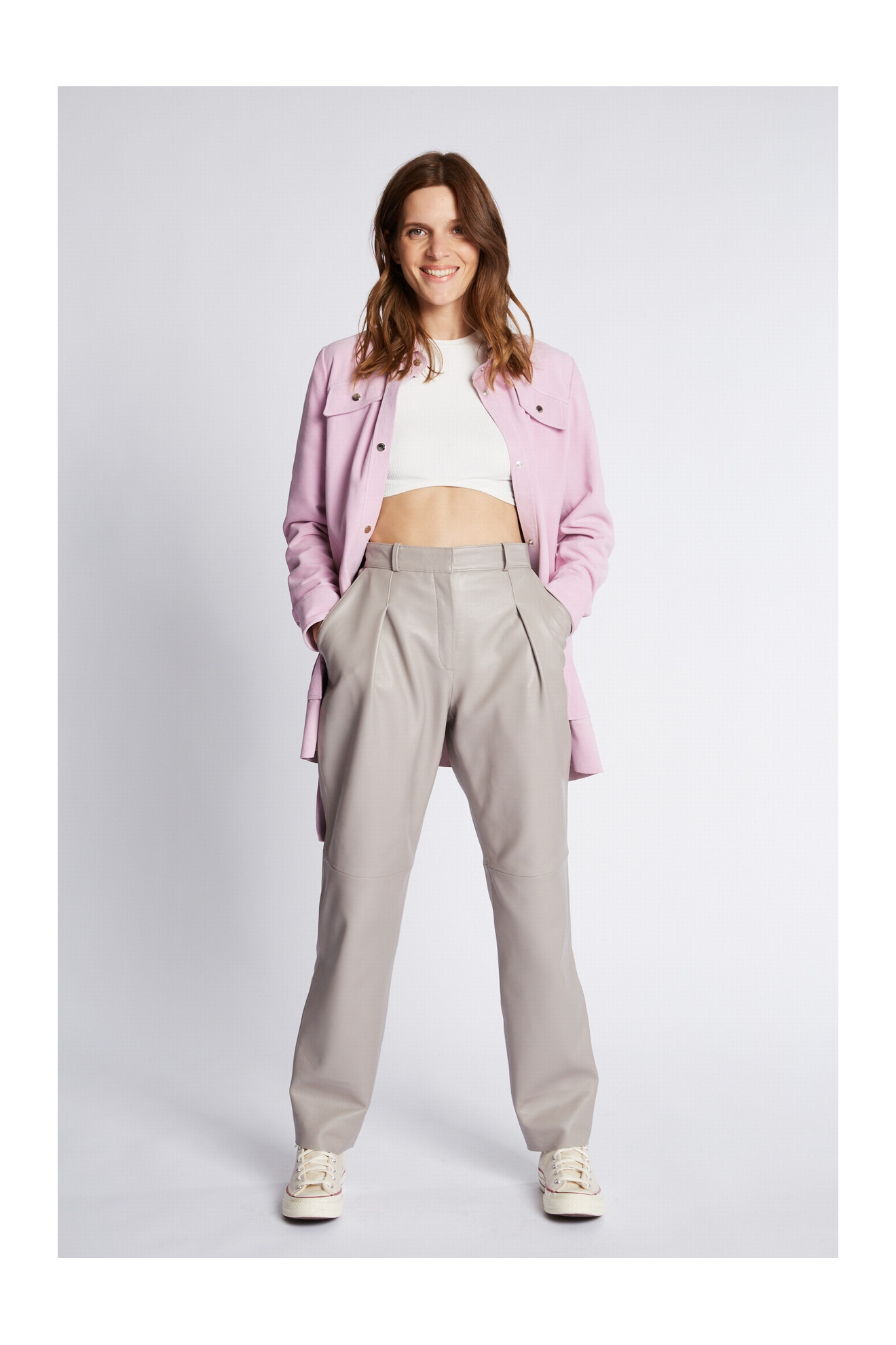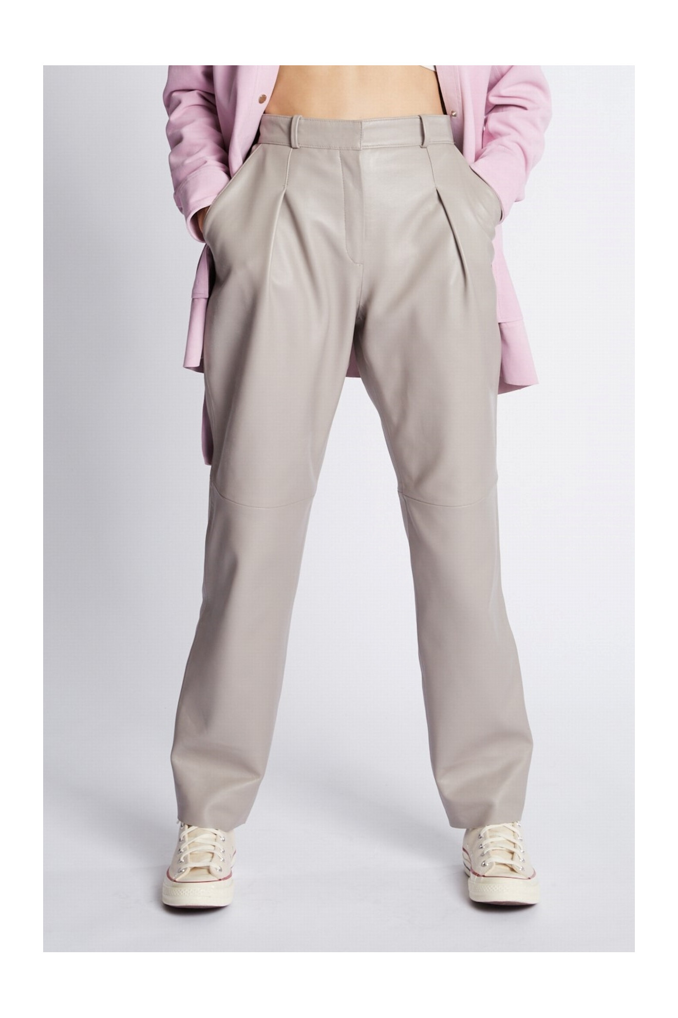 Le modèle SILA WAXY est un pantalon à pinces en cuir d'agneau.