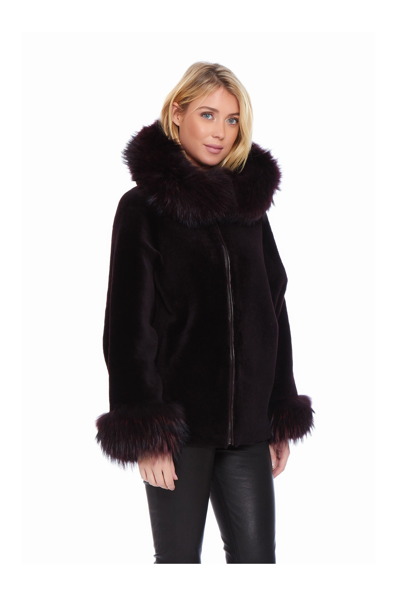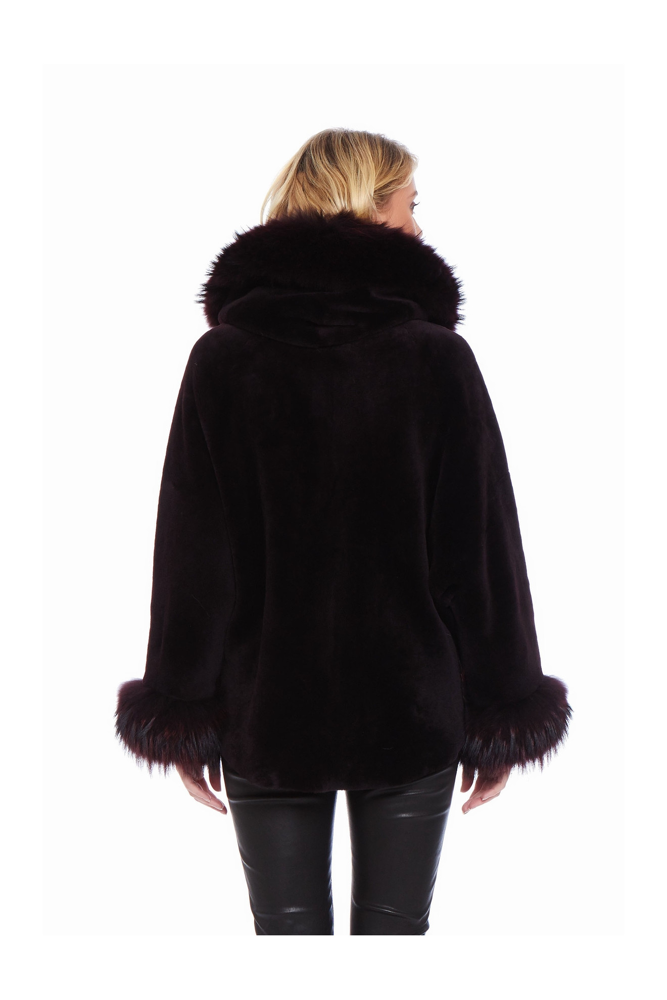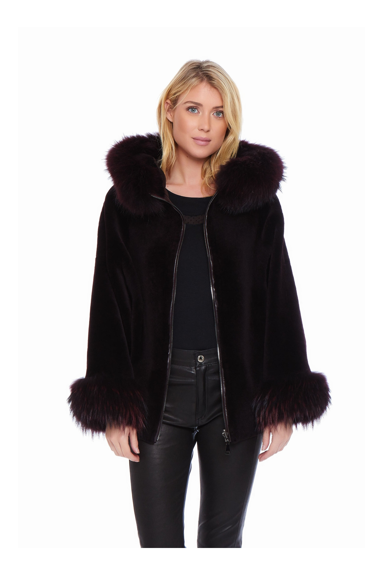 Le modèle AIKO SOFT est un manteau style cape en peau d'agneau avec une capuche bordée de fourrure.