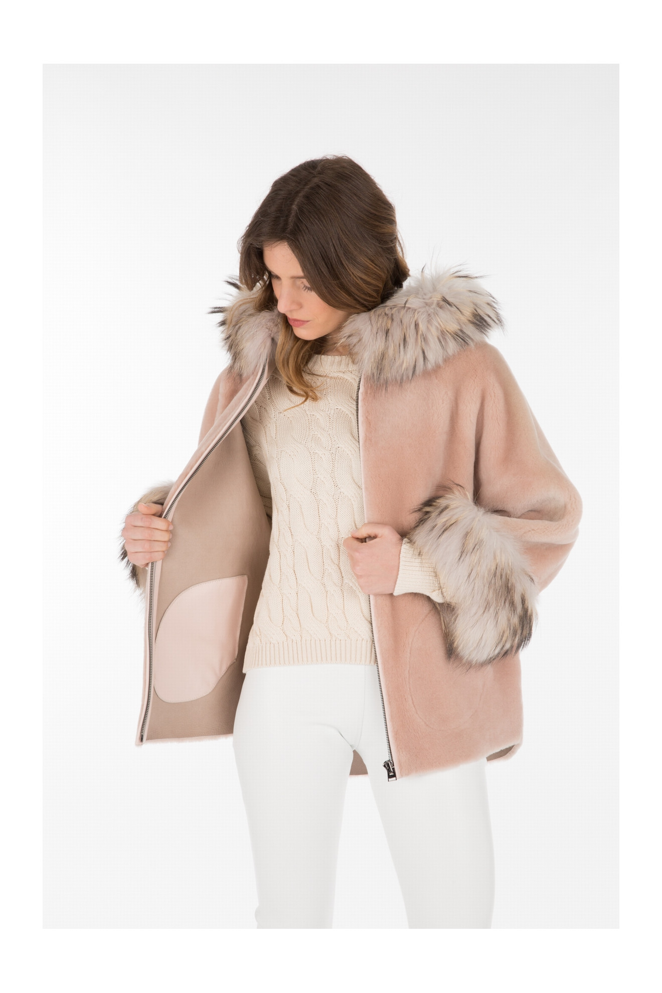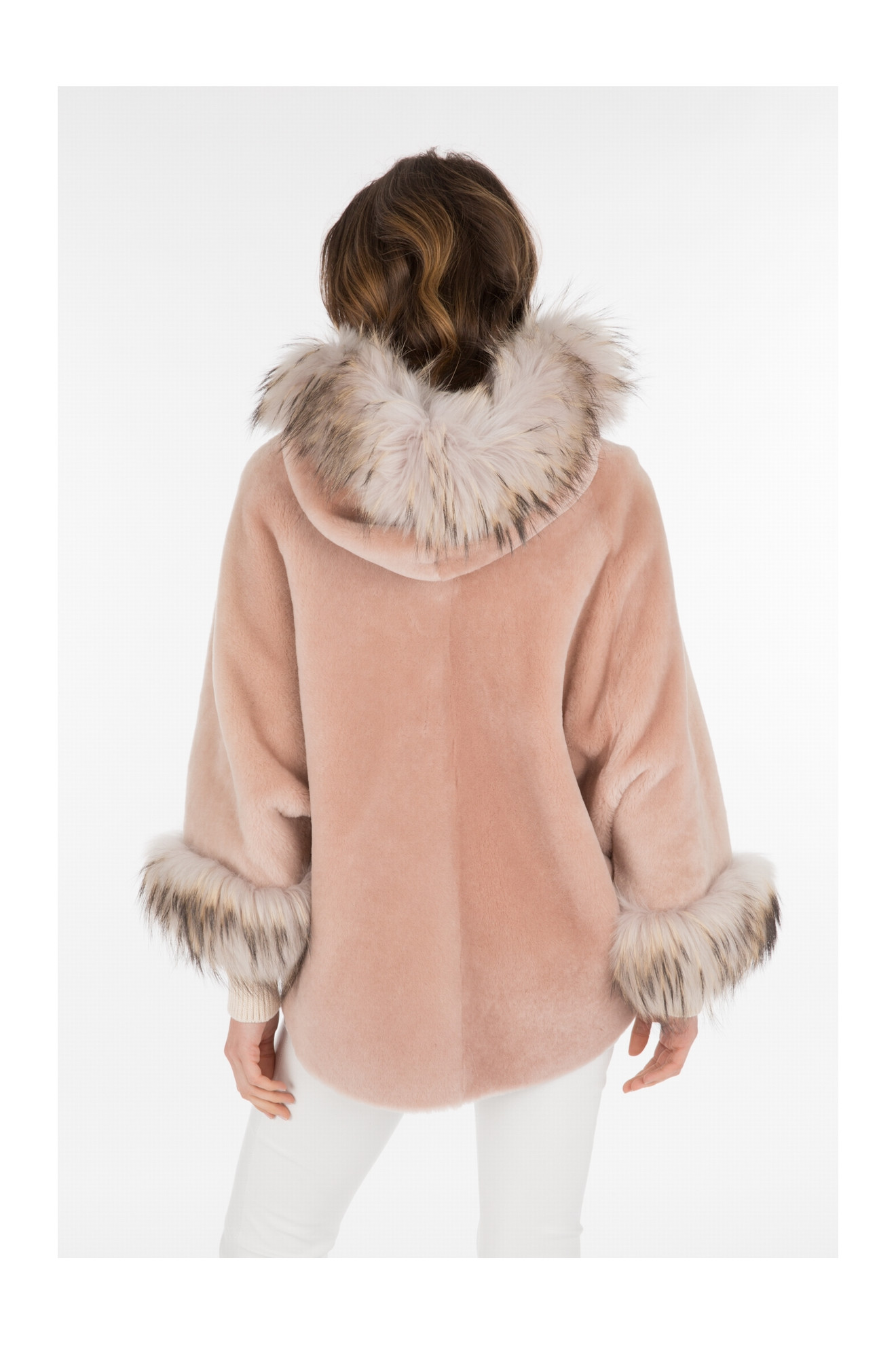 Le modèle AIKO SOFT est un manteau style cape en peau d'agneau avec une capuche bordée de fourrure.