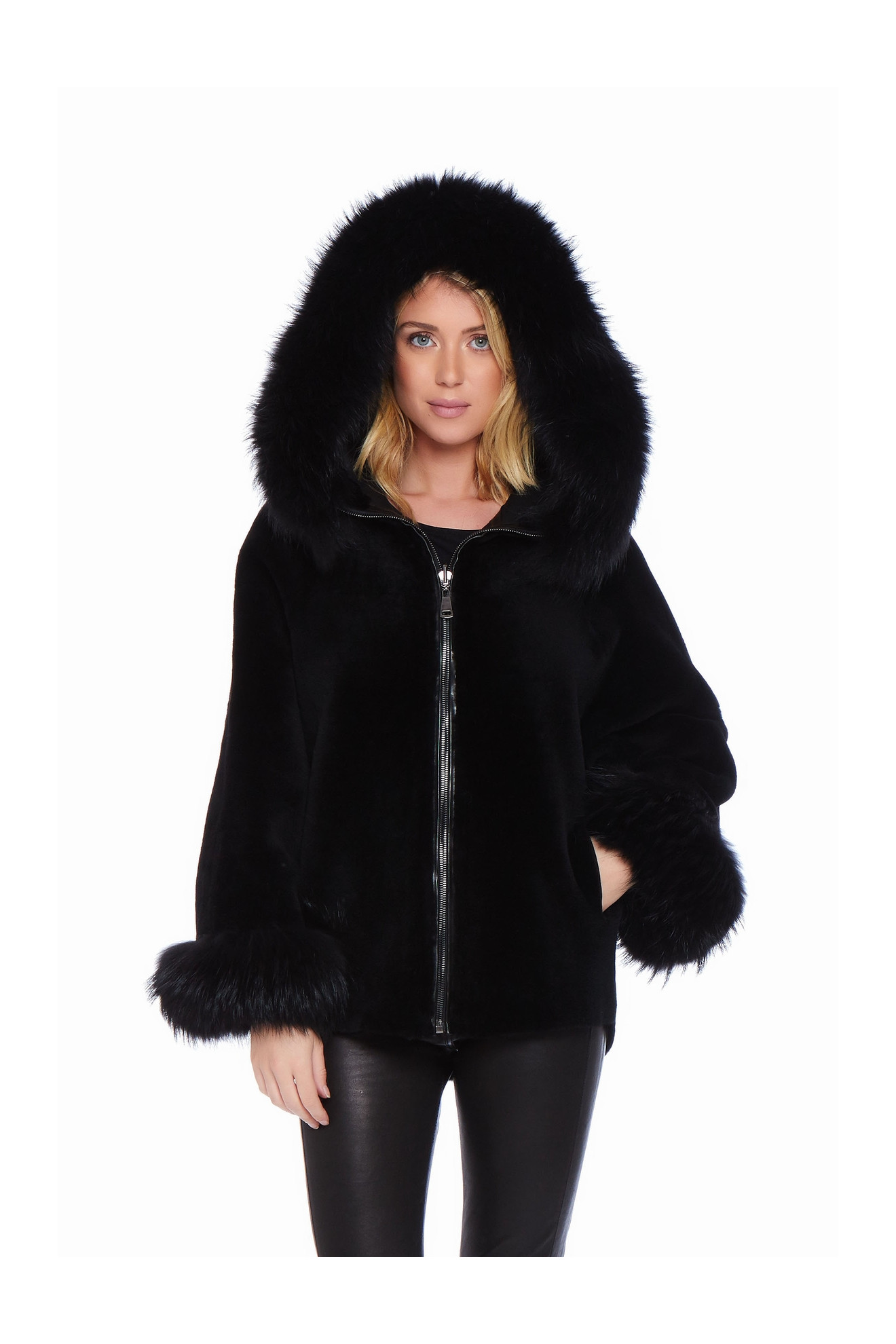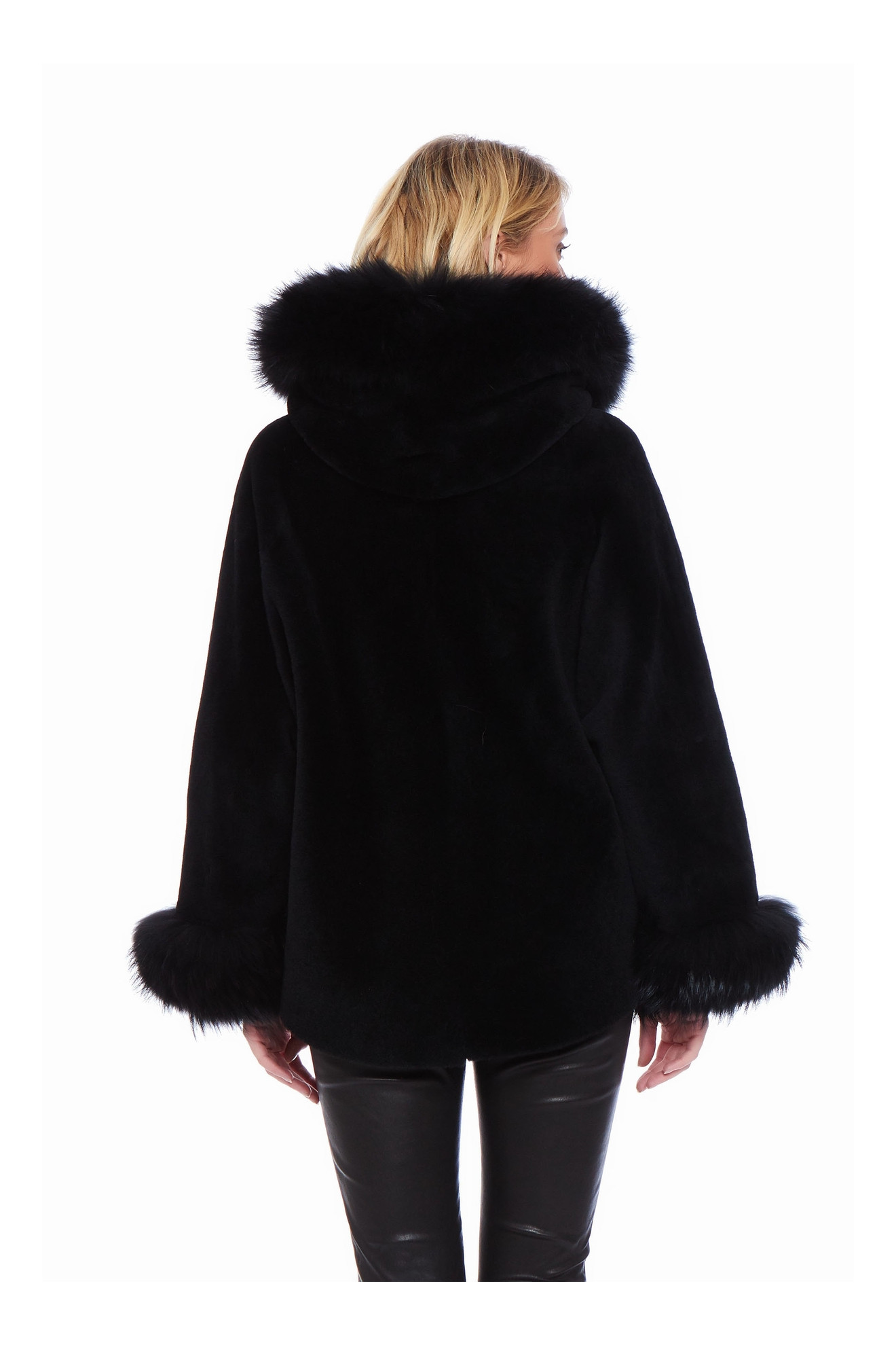 Le modèle AIKO SOFT est un manteau style cape en peau d'agneau avec une capuche bordée de fourrure.