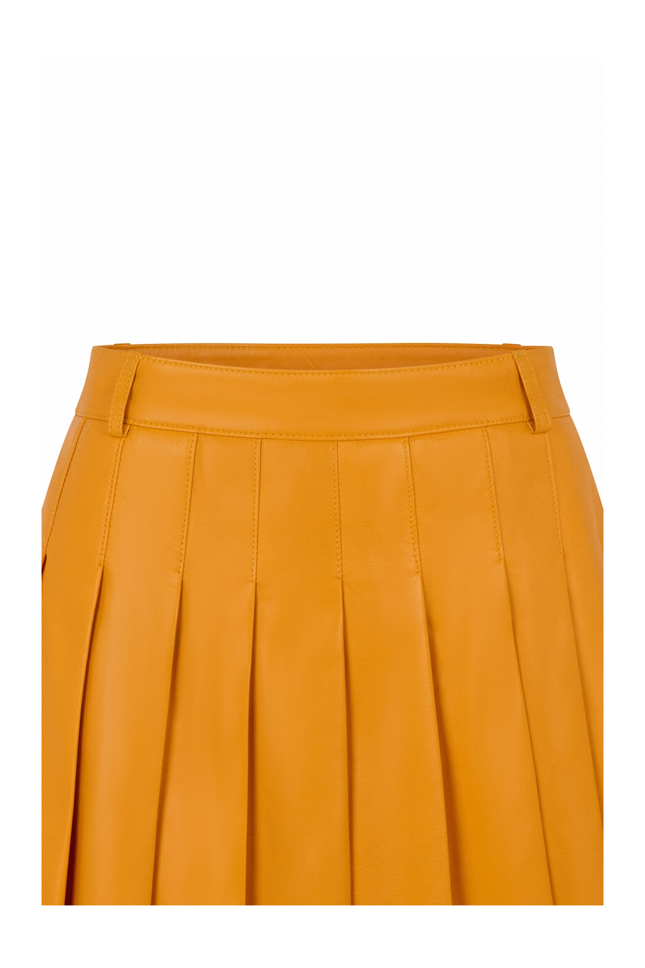 Découvrez le modèle TERNAY, une jupe plissée en cuir d’agneau qui allie sophistication et modernité.