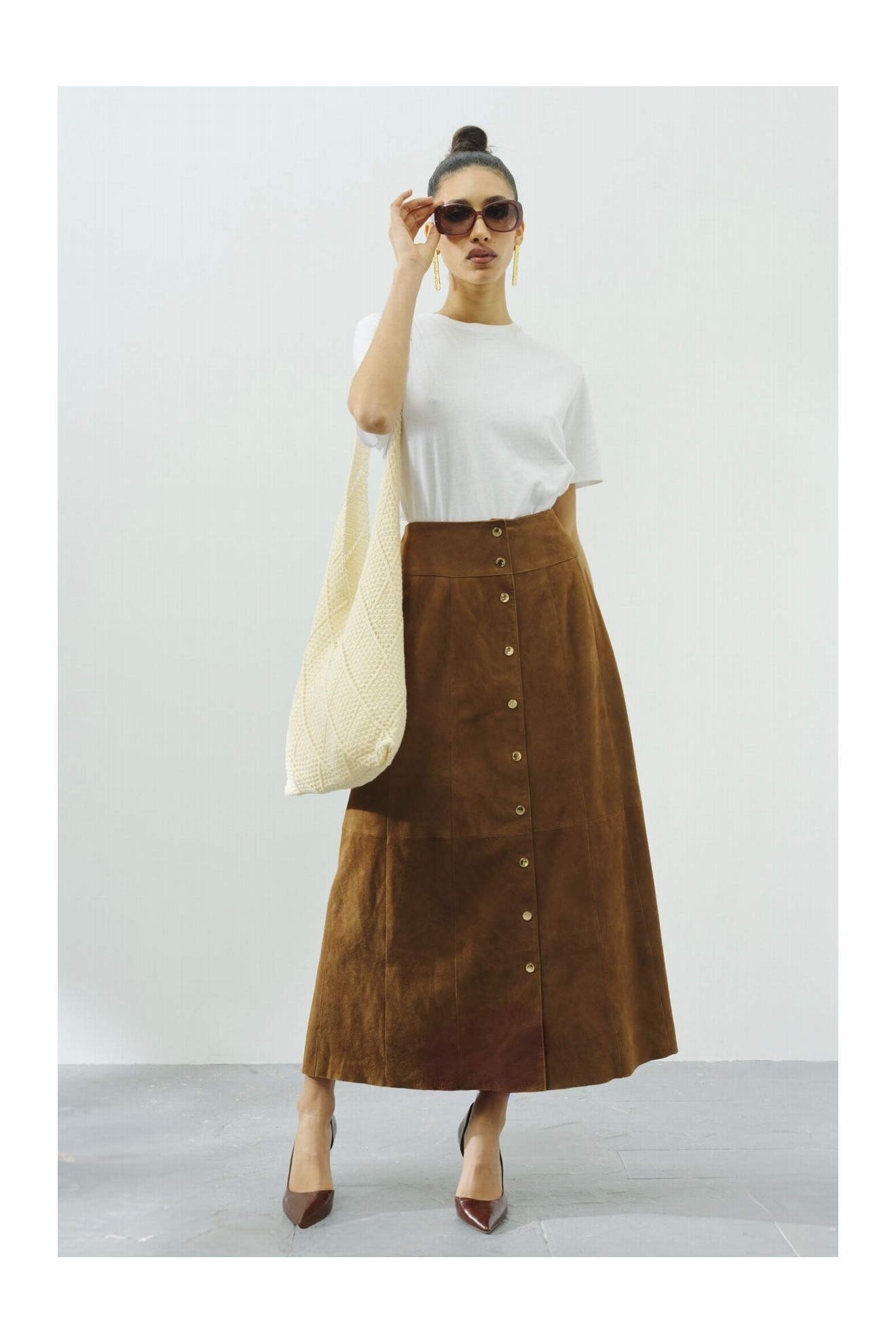 Le modèle FLORETTE LONG est une splendide jupe longue en daim.