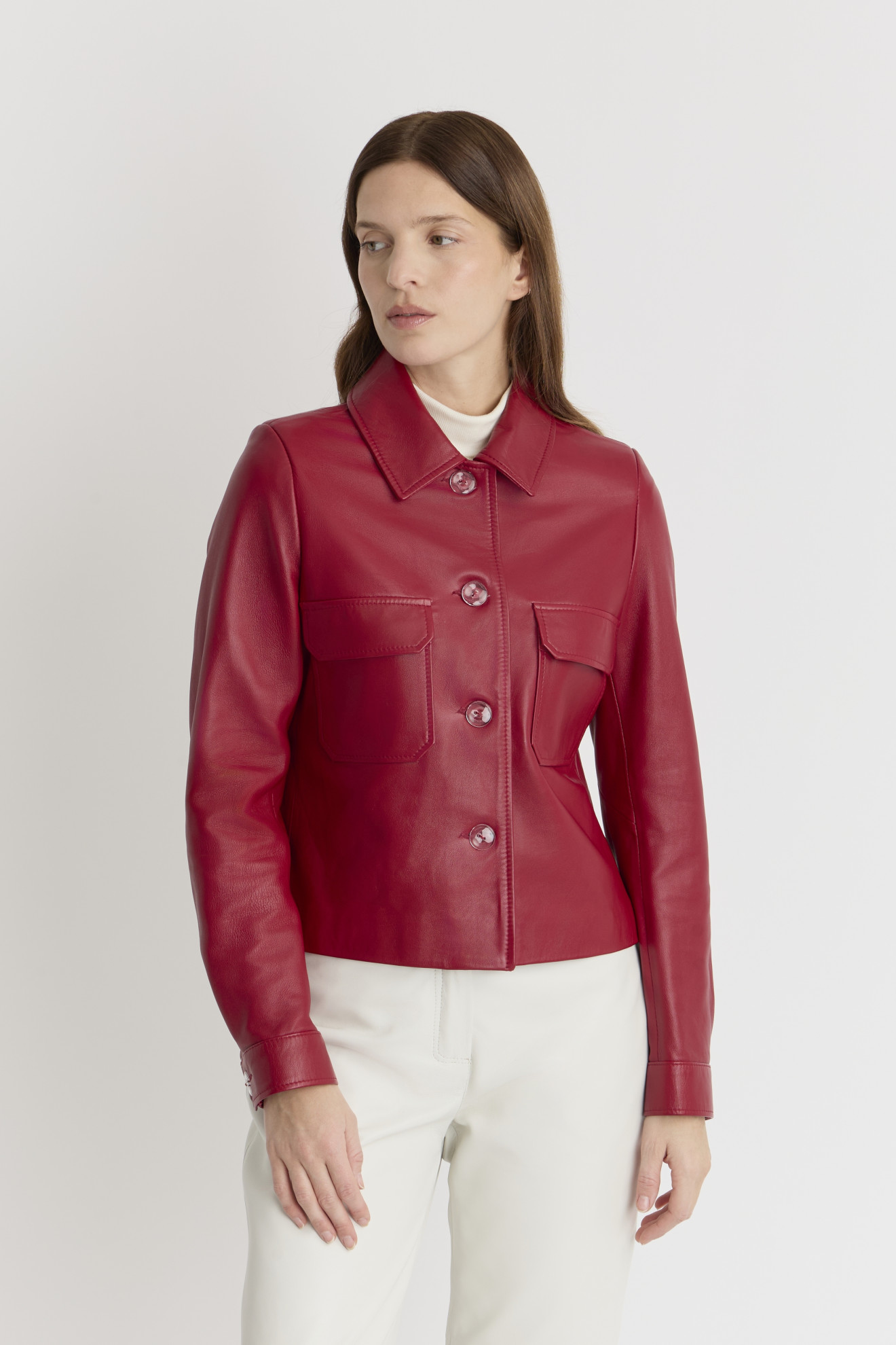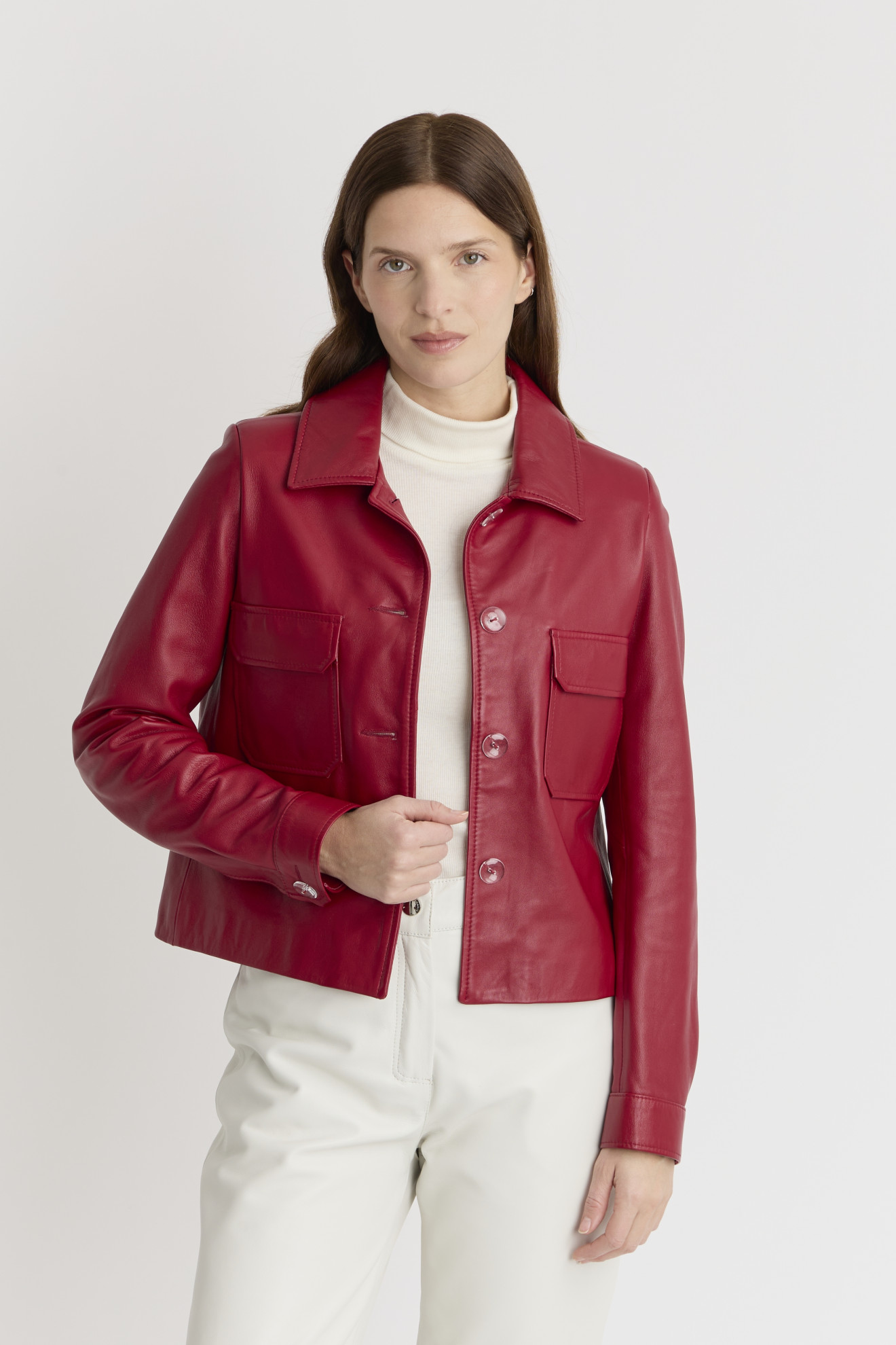 Conçue en cuir d'agneau de haute qualité, cette veste courte à manches longues présente un col chemise raffiné qui ajoute une touche intemporelle à votre look.