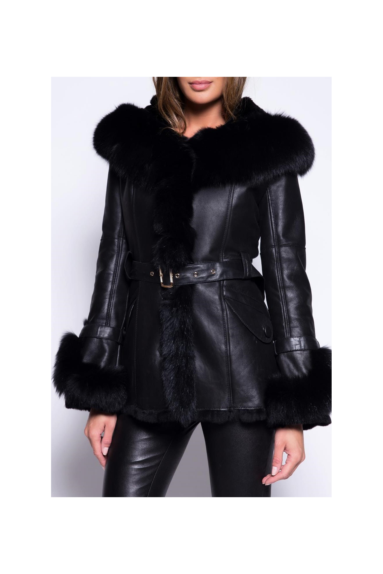 Le modèle LORENA est une veste en cuir d'agneau avec capuche.