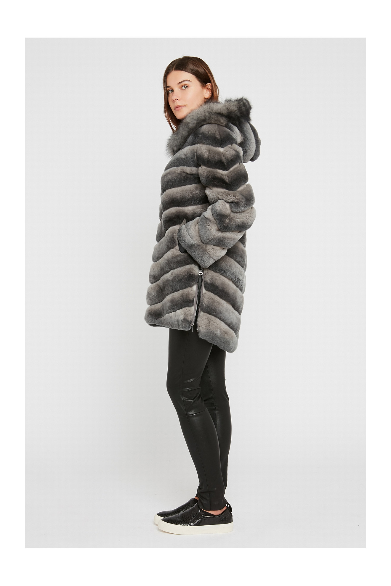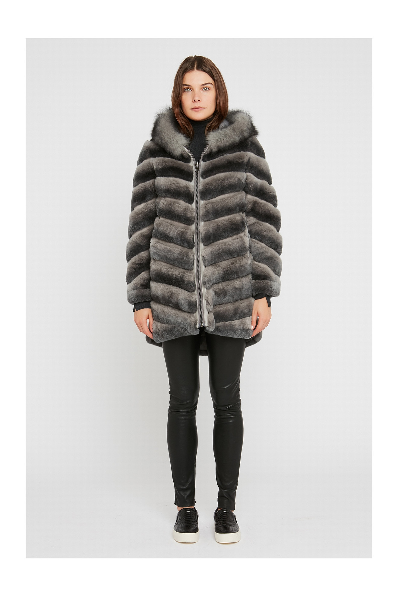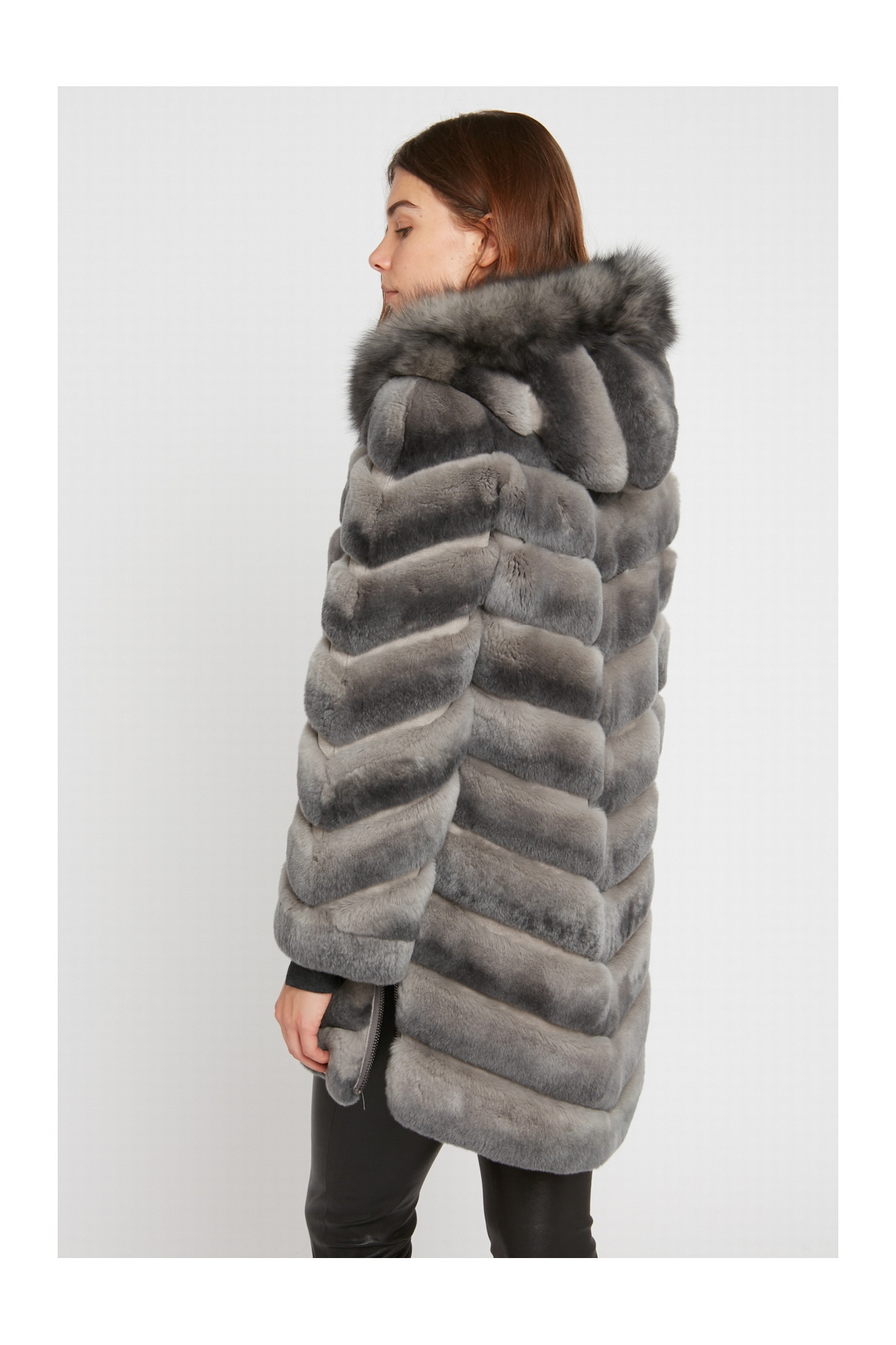 Le modèle SHANTTI REX LONG est un manteau réversible en fourrure de lapin rex avec une capuche.